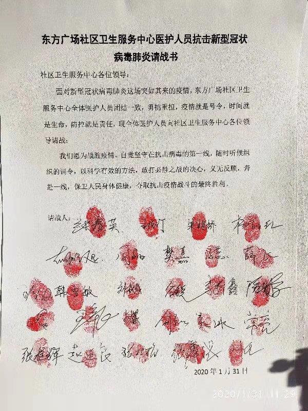 1月31日,学校东方广场社区卫生服务中心26名医护人员共同签署了抗击新型冠状病毒肺炎的请战书,勇做百姓的健康卫士!(文 张鏖谧 李春赫 图 王悦竹 审核 张春英 王宁 社区卫生服务中心 宣传部供稿)