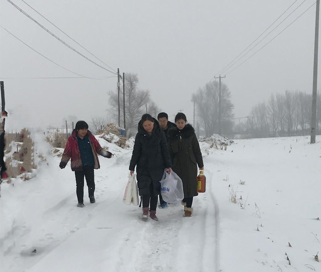 临床医学党总支副书记、学办主任杨敬然及班级辅导员白雪松、陈曦、赵琦一行人带着面粉、豆油、肉等生活必需品,冒着严寒来到了经济困难学生家庭,将一声声问候、一缕缕真情送到贫困学生的家中。访谈侧重询问受访学生家庭生活情况、经济状况、经济来源、面临的困难等,并向家长汇报了学生在校的表现和学习生活情况,介绍了上级及学校的资助、帮扶政策。