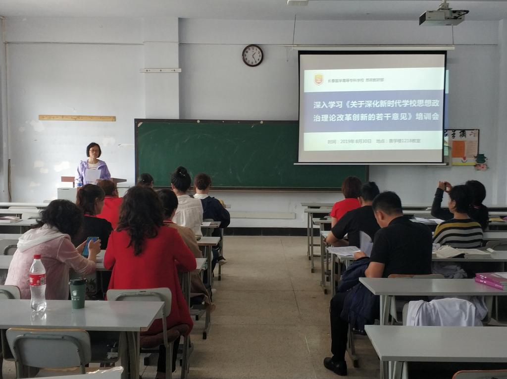 部门全体教师结合新学期教职工大会上校领导讲话内容,以贯彻落实讲话精神为目标,深入学习中共中央,国务院印发的《关于深化新代学校思想政治理论改革创新的若干意见》文件精神;坚持理论联系实际,由王萍和张娜两位教师针对外出研修经历,向大家分享研修学习心得,在开拓眼界与思路的同时,为医专未来的思政课程建设提供新的方向;部门严格落实省教育厅的要求,紧跟当前政治局势,全员开展中美经贸摩擦形势与政策教育专题示范教学,效果良好。