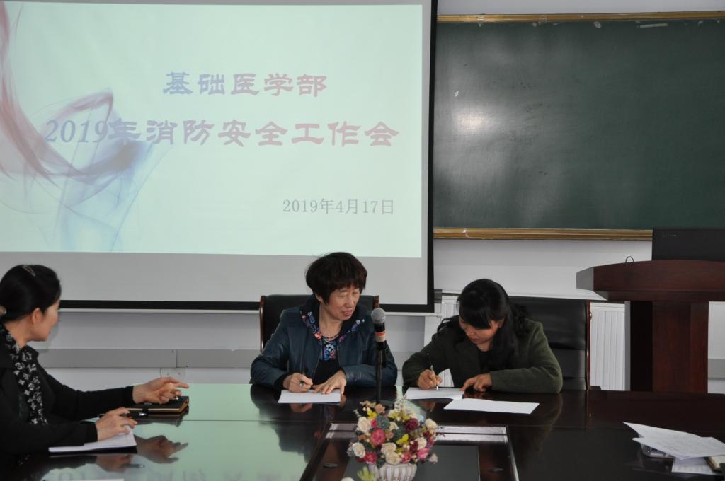 会上,基础医学部主任王春梅宣读了学校《2019年校园及周边消防安全工作方案》,从落实组织机构和岗位职责、强化消防设施应用管理、集中清理火灾隐患问题、加大消防安全宣传教育四个方面,传达了学校文件精神。并根据《基础医学部2019年扫黑除恶、消防安全、生产安全工作目标责任书》方案,对安全四防相关工作进行了全面部署。她指出,各责任部门要进一步明确领导责任,规范安全治理体系,切实加强对安全工作的检查管理力度,严格按照网格化管理职责,本着“谁主管,谁负责”的原则,将安全工作落实到实处;要建立健全消防安全管理机构,明确逐级、逐岗位消防安全职责;按照建筑消防设施检查维保的有关规定,对设施进行检查和维修保养,对建筑消防设施每年至少进行一次全面检查,确保完好有效;要每日对安全疏散通道出口畅通情况、建筑消防设施运行和管理情况、危险化学品安全管理情况等进行巡查检查;要对上课学生加大实验室安全及消防安全知识教育,生命科学馆电子屏幕每月至少宣传一次防火内容,切实增强师生消防安全意识和自防自救能力。