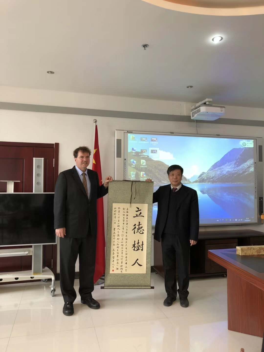 薛春志校长代表我校对总领事一行表示热烈欢迎,对澳大利亚联邦在沈阳成立总领事馆表示热烈祝贺。同时,详细介绍了我校办学历史、专业设置、教学科研、师资培养、招生就业以及与澳大利亚院校合作交流的相关情况。随后,双方结合职业培训、养老模式、医药研发等行业的未来发展趋势,针对学校相关专业的合作空间进行了深入会谈。Robertson先生代表澳洲政府对我校与启思蒙职业技术学院的合作交流工作给予充分肯定,并表示澳大利亚驻沈阳总领事馆愿意努力为我校与澳大利亚相关院校和机构开展国际合作交流工作提供支持与服务。