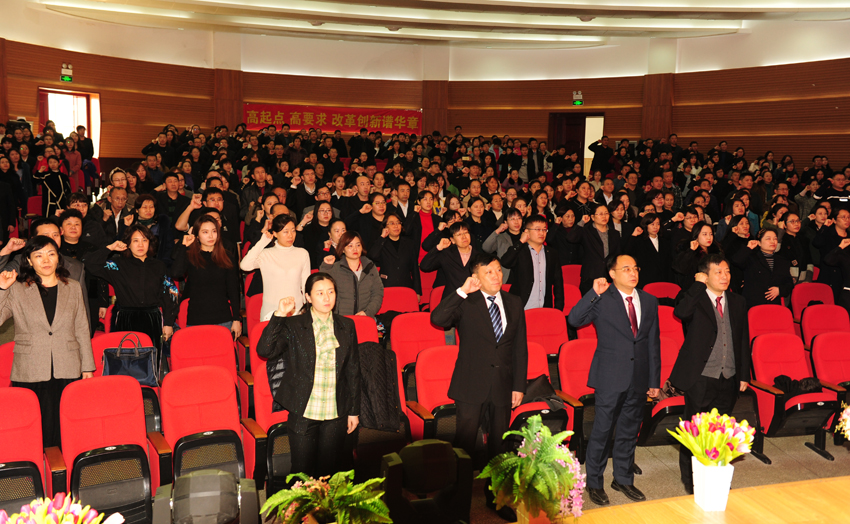大会在庄严的国歌声拉开序幕。全校教职工在副校长袁兆新的带领下庄严宣誓,诠释医专人“执教忘名、授业求精”的精神理念。