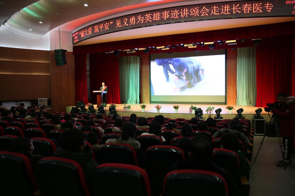 1月3日下午,由长春市公安局、长春市委宣传部、长春市精神文明办公室主办,长春市见义勇为工作办公室、见义勇为志愿者协会承办的“‘献大爱 筑平安’见义勇为英雄事迹讲颂会走进长春医专”在学校图书馆二楼报告厅举行。全校教职工参会。