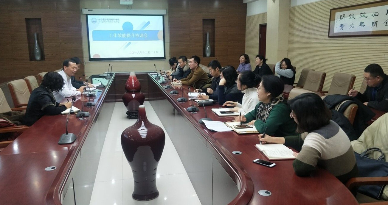 王迪新结合《中共长春医学高等专科学校委员会关于成立学校工作效能提升领导小组的通知》,详细部署了学校工作效能提升领导小组理顺部门职能、全面优化服务、实现精干高效、践行科学管理共四项主要任务,结合近期与长远、数量和质量、抓大与放小等原则,与小组成员共同确立了小组工作的阶段性目标,并探讨了下一步开展工作主要做法。