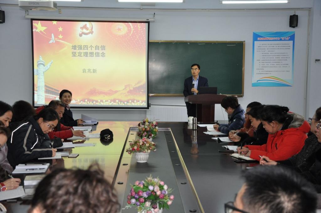 袁兆新结合自身学习和工作体会,深刻阐述了“四个自信”的内涵以及为什么要坚定理想信念、增强四个自信。从细微处生动诠释了一名党员应具有怎样的理想和爱国情怀,为全体党员上了一堂十分精彩的党课。袁兆新围绕诊改,号召全体党员以习近平新时代中国特色社会主义思想为指导,坚持社会主义办学方向,落实立德树人根本任务,充分发挥课堂主渠道在高校思想政治工作中的作用,大力推动以“课程思政”为目标的课堂教学改革,实现知识传授、价值引领和能力提升的有机统一。面对新时代、新使命,全体党员要坚定“四个自信”,做新时代的灵魂工程师,为共产主义奋斗终身!