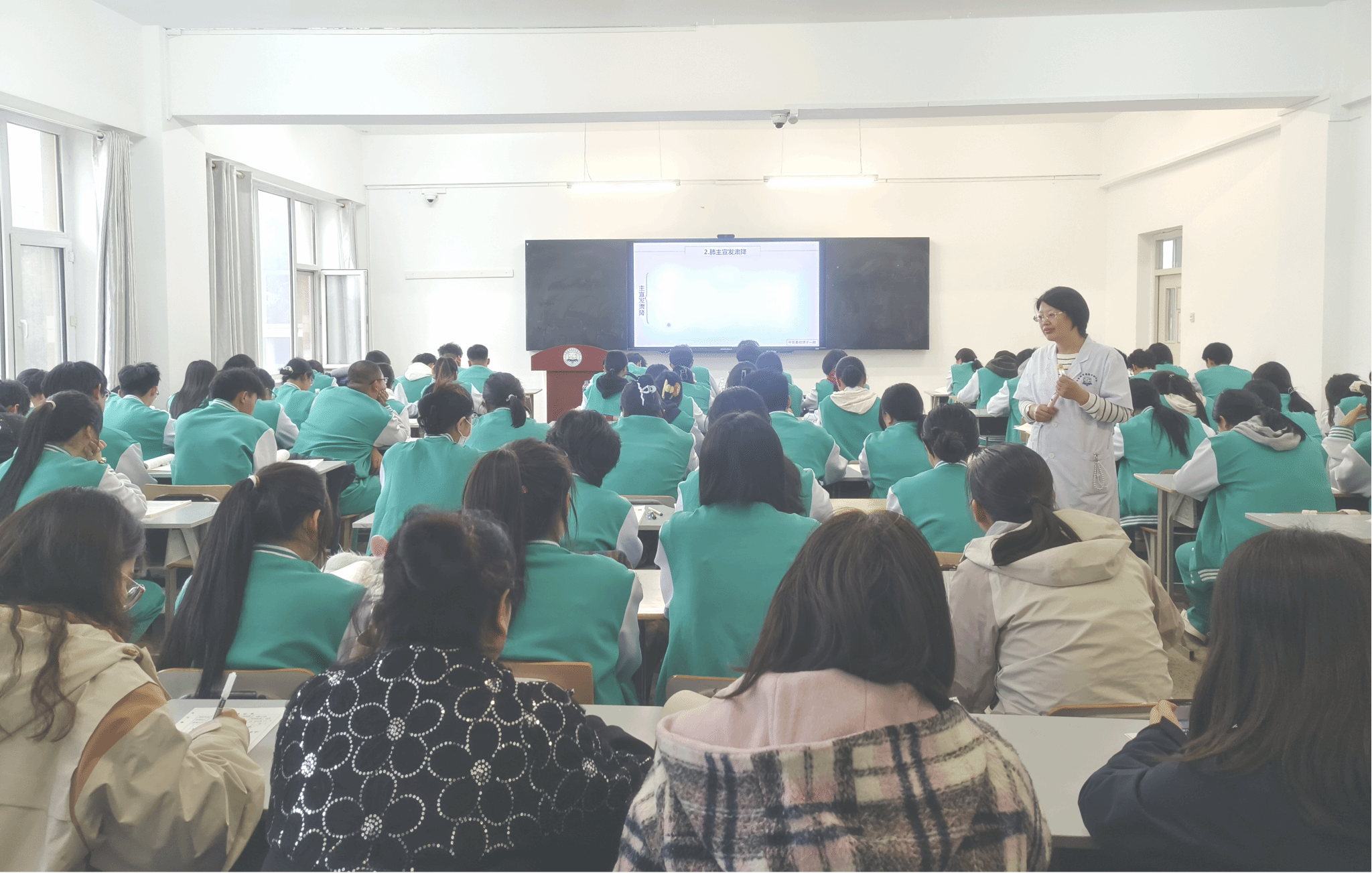 在核心教学环节,田丹围绕“肺”的解剖位置、形态结构、主要功能、生理特性及生理联属展开分享,同步巧妙融入课程思政元素。针对教学中“理论难结合实践与价值引领”的难题,她创新提出“辨功能--观体征--联系统--融思政”四维导学路径。通过生动讲解面色、脉象、舌象等外在征象判断肺功能状态的方法,赋能中医辨证实践。她强调,学习需紧扣整体观念,实现“理论认知”与“辨证实践”深度融合,为教师教学与学生理解提供明确指引。