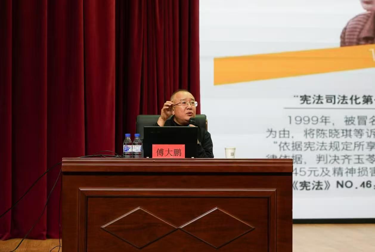 为深入学习贯彻习近平法治思想,大力弘扬宪法精神,切实提升全校师生法治素养与依法执业能力,推动法治教育与医德修养深度融合,12月2日,“维护宪法权威,加强宪法实施”专题讲座在学校图书馆报告厅顺利举行。本次讲座特邀吉林省委党校法学教研部主任傅大鹏教授专题授课,学校500余名师生代表参加活动,活动由学生工作处李思骏老师主持。