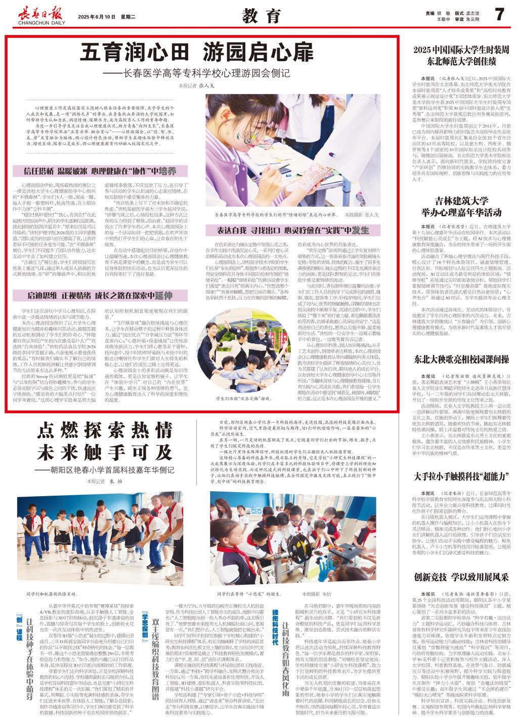 心理健康工作是高校落实立德树人根本任务的重要保障,关乎学生的个人成长和发展,是一项“润物无声”的事业。在青春热血奔涌的大学校园里,如何帮助学生认知自我、调适情绪、缓解压力,成为高校育人工作的重要命题。为进一步引导学生关注自我心理健康状况,助力青春“向阳生长”长春医学高等专科学校举办“五育并举 融合育心”--心理游园会,以“德、智、体、美、劳”五育融合为脉络,精心设计特色活动,帮助学生在趣味体验中释放压力、增进互动、探索心灵成长,将心理健康教育巧妙融入校园文化之中。