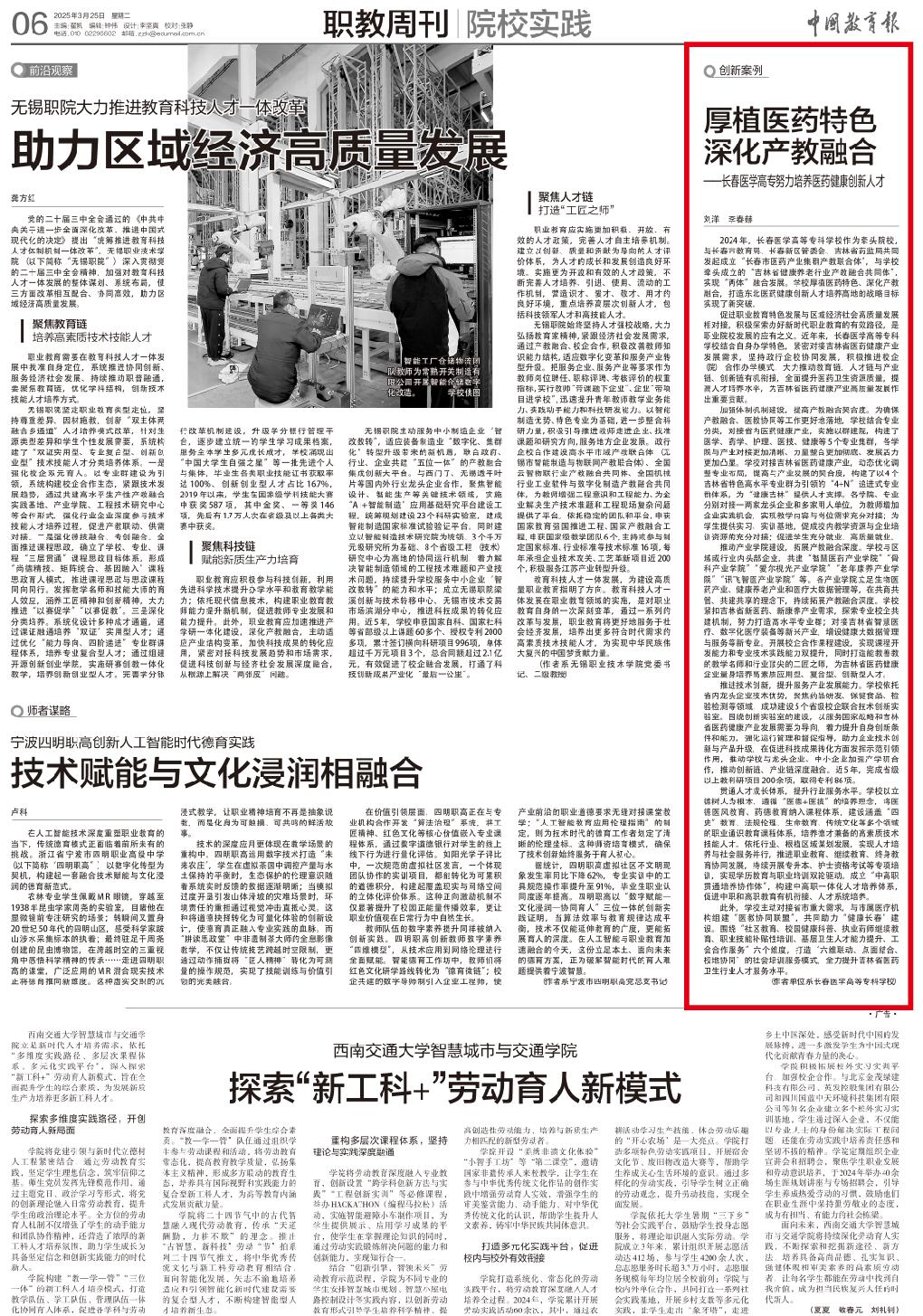 2024年,长春医学高等专科学校作为牵头院校,与长春市教育局、长春新区管委会、吉林省药监局共同发起成立“长春市医药产业集群产教联合体”,与学校牵头成立的“吉林省健康养老行业产教融合共同体”,实现“两体”融合发展。学校厚植医药特色、深化产教融合,打造东北医药健康创新人才培养高地的战略目标实现了新突破。