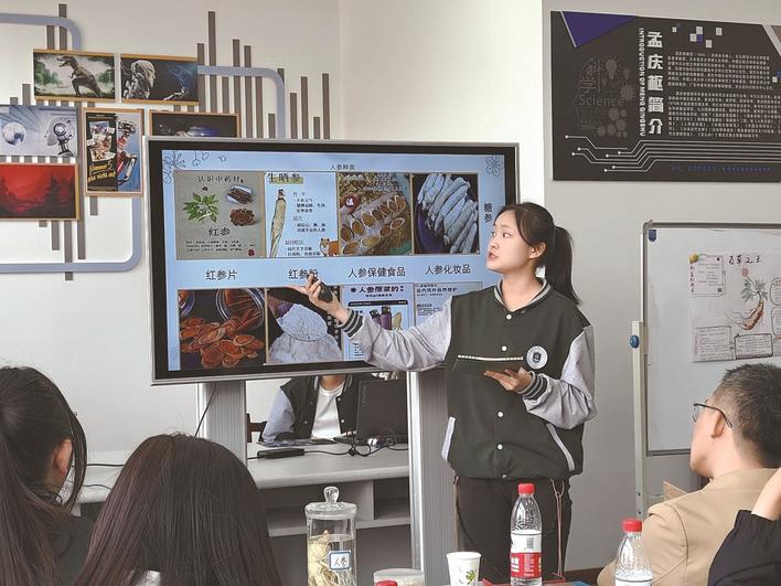 面对两位老师,2023级中药一班的同学们也展示了自己平时读书学习的收获。药材接龙小游戏让会场气氛迅速升温,关于人参知识的有奖问答吸引大家积极参与。同学们还以小组为单位,通过手绘人参结构、实物展示、思维导图、视频播放等形式展示了自己读书的收获。在展示的过程中,各小组风格各异,语言诙谐幽默,现场互动频繁,参会的老师们一边品尝参茶,一边热情参与讨论。