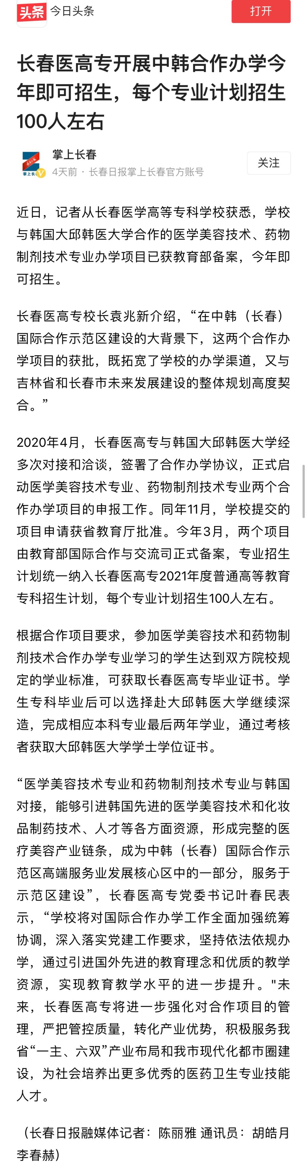长春医高专开展中韩合作办学今年即可招生,每个专业计划招生100人左右