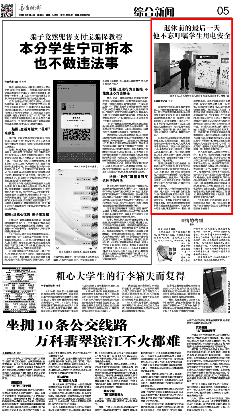 看着一批又一批的萌新来到学校报到,马文刚说,今年没机会和这些“小孩”强调别在寝室用小电炉、卷发棒等违禁电器了。马文刚告诉记者,寝室安全一直是保卫处的工作重点,尤其是女寝,女生喜欢用的卷发棒是非常不适合在寝室里用的。“如果大家一起卷头发,寝室里只有一个插排,就容易超负荷。手机充电器使用时也要注意,寝室的同学尽量不要一起充电。”说起这些注意事项,马文刚比谁记得都清楚。“每天晚上三次巡逻,白天三次巡逻,要对学校各个方面安全做好保障工作。”马文刚说,在工作期间,他们每天8时30分对各个楼的巡视员进行查岗登记;10时进行校园全范围巡视;14时30分再在校园内巡视一圈。17时以后,晚班上岗,继续开始3次巡逻。“马老师巡逻非常认真,有一次凌晨三四点发现食堂食杂店内电器冒烟,还好他及时发现、迅速使用灭火器灭火,没有让意外发生。”采访过程中,学校的一位老师主动和记者说起马文刚是学校老师们心中的“灭火英雄”,但是马文刚却笑着说:“这不值得一提,都是应该做的事。”